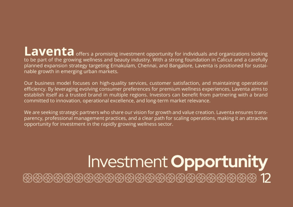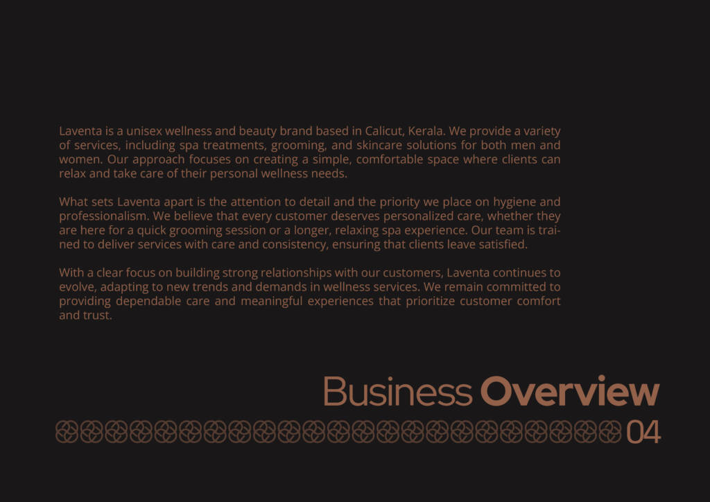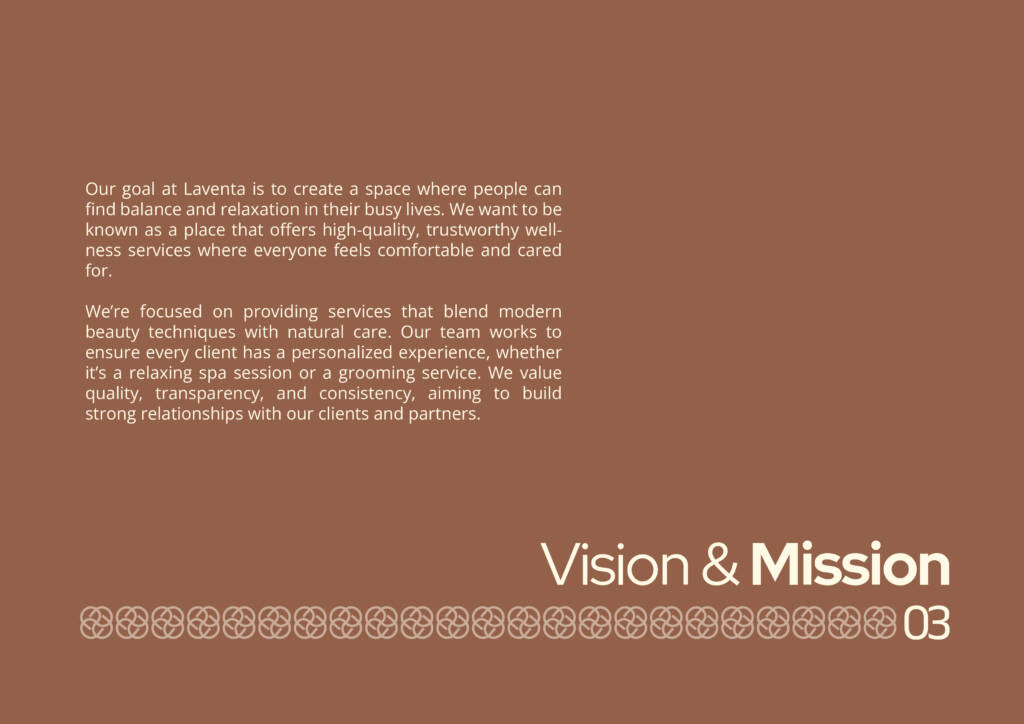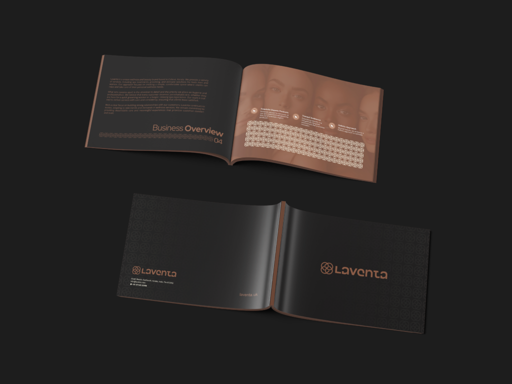 Typography was carefully selected to convey a sense of luxury and refinement without overshadowing the narrative. Each page was structured to flow intuitively, blending visuals and information to represent Laventa’s values of authenticity, quality, and holistic care. The result is a polished, human-centric presentation that effectively communicates the brand’s story and aspirations.